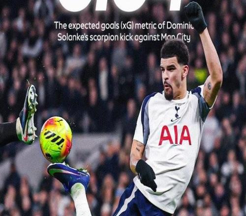 梅开二度,索兰克当选热刺vs曼城全场最佳球员